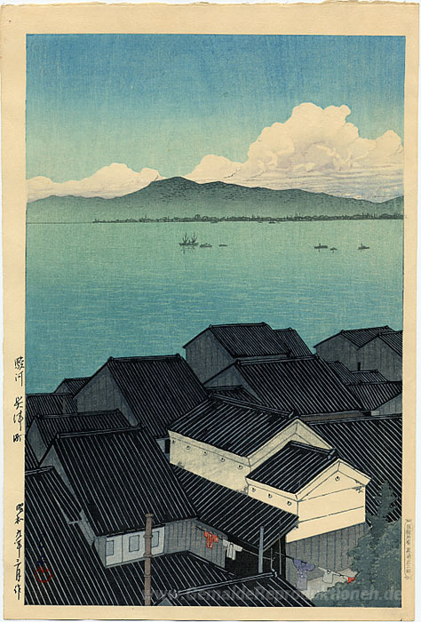 Wir bieten Ihnen eine handgefertigte Reproduktion auf Leinwand des berühmten Kunstwerks 'Okitsu-cho, Suruga' von Hasui Kawase, aus dem Reproduktionsmuseum.