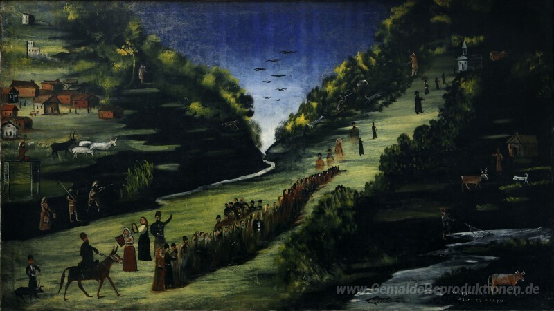 Wir bieten Ihnen eine handgefertigte Reproduktion auf Leinwand des berühmten Kunstwerks 'Partei durch den Fluss Tskheniszkali' von Niko Pirosmani, aus dem Reproduktionsmuseum.