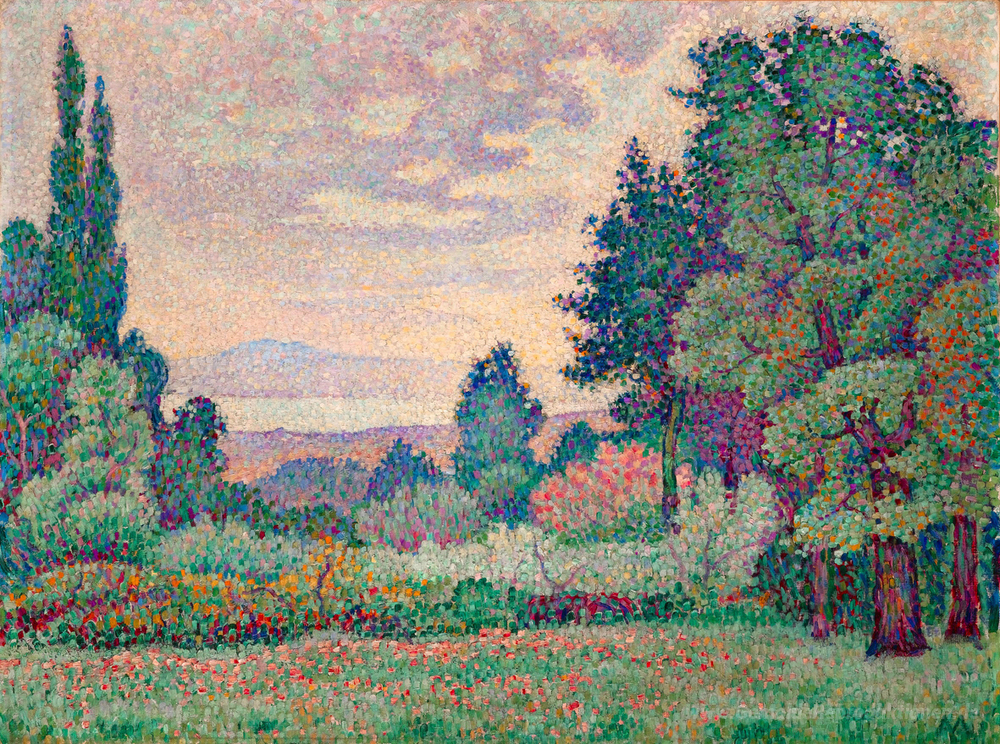 Wir bieten Ihnen eine handgefertigte Reproduktion auf Leinwand des berühmten Kunstwerks 'Paysage aux deux Cyprés' von Jean Metzinger, aus dem Reproduktionsmuseum.