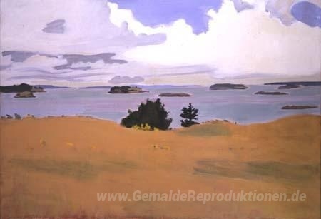 Wir bieten Ihnen eine handgefertigte Reproduktion auf Leinwand des berühmten Kunstwerks 'Penobscot Bay mit gelben Feld' von Fairfield Porter, aus dem Reproduktionsmuseum.