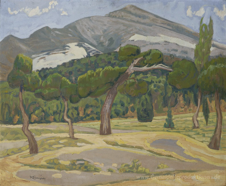 Wir bieten Ihnen eine handgefertigte Reproduktion auf Leinwand des berühmten Kunstwerks 'Penteli Landschaft' von Constantine Maleas, aus dem Reproduktionsmuseum.