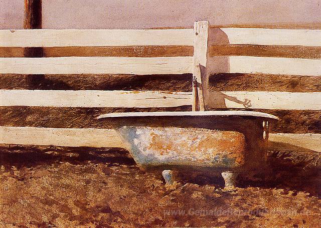Wir bieten Ihnen eine handgefertigte Reproduktion auf Leinwand des berühmten Kunstwerks 'Pferde Tub' von Jamie Wyeth, aus dem Reproduktionsmuseum.