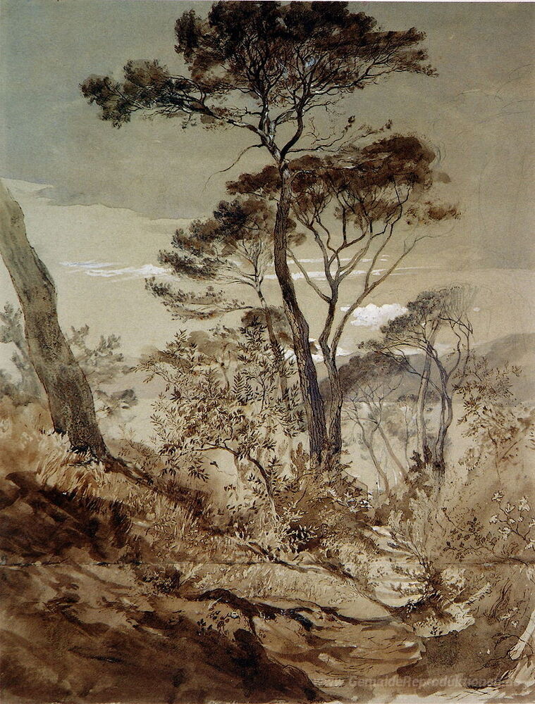 Wir bieten Ihnen eine handgefertigte Reproduktion auf Leinwand des berühmten Kunstwerks 'Pinien von Sestri' von John Ruskin, aus dem Reproduktionsmuseum.