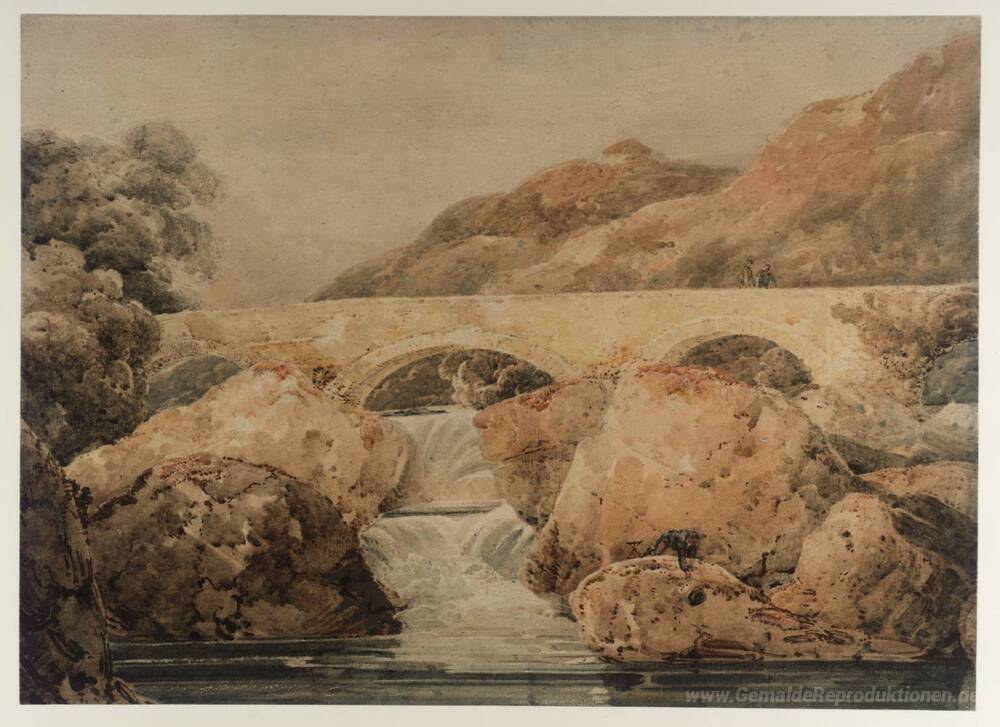 Wir bieten Ihnen eine handgefertigte Reproduktion auf Leinwand des berühmten Kunstwerks 'Pont-y-Pair' von Thomas Girtin, aus dem Reproduktionsmuseum.