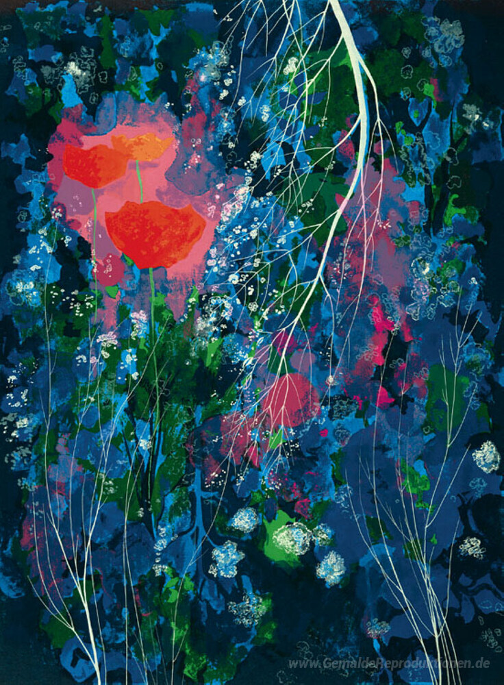 Wir bieten Ihnen eine handgefertigte Reproduktion auf Leinwand des berühmten Kunstwerks 'Poppies' von Eyvind Earle, aus dem Reproduktionsmuseum.