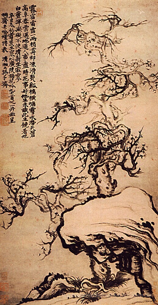 Wir bieten Ihnen eine handgefertigte Reproduktion auf Leinwand des berühmten Kunstwerks 'Prunus zwischen den Felsen' von Shitao, aus dem Reproduktionsmuseum.