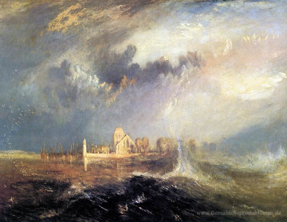 Wir bieten Ihnen eine handgefertigte Reproduktion auf Leinwand des berühmten Kunstwerks 'Quillebeuf, an der Mündung der Seine' von William Turner, aus dem Reproduktionsmuseum.