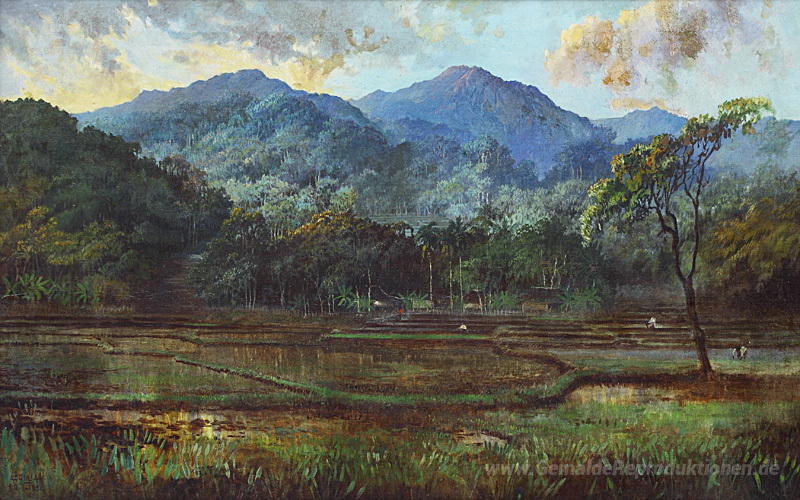 Wir bieten Ihnen eine handgefertigte Reproduktion auf Leinwand des berühmten Kunstwerks 'Reisfeld' von Abdullah Suriosubroto, aus dem Reproduktionsmuseum.