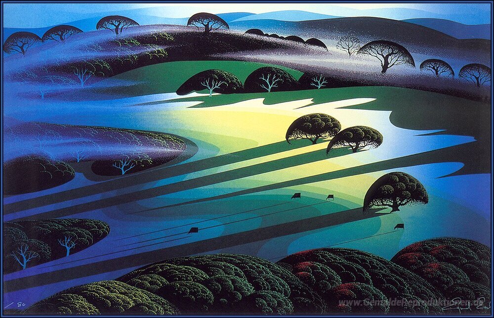 Wir bieten Ihnen eine handgefertigte Reproduktion auf Leinwand des berühmten Kunstwerks 'Ruhige Weide' von Eyvind Earle, aus dem Reproduktionsmuseum.