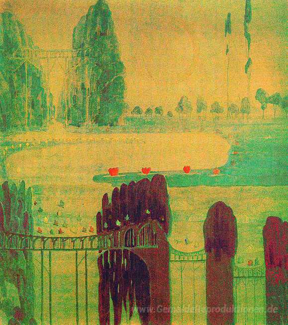 Wir bieten Ihnen eine handgefertigte Reproduktion auf Leinwand des berühmten Kunstwerks 'Scherzo (Sonata der Sonne)' von Mikalojus Ciurlionis, aus dem Reproduktionsmuseum.