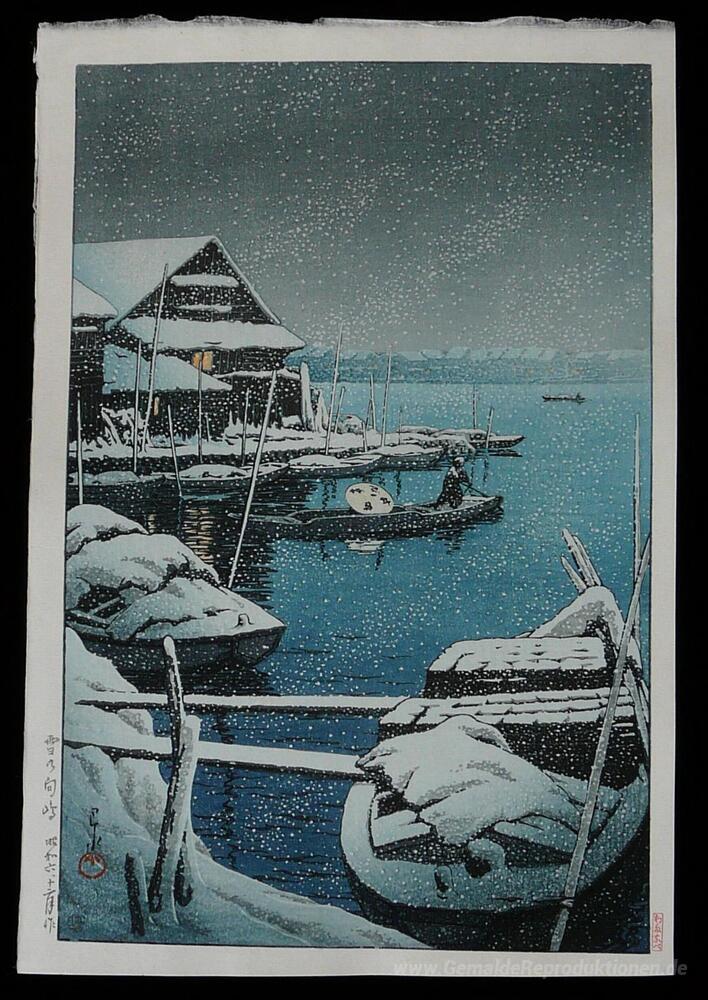 Wir bieten Ihnen eine handgefertigte Reproduktion auf Leinwand des berühmten Kunstwerks 'Schnee am Mukojima' von Hasui Kawase, aus dem Reproduktionsmuseum.