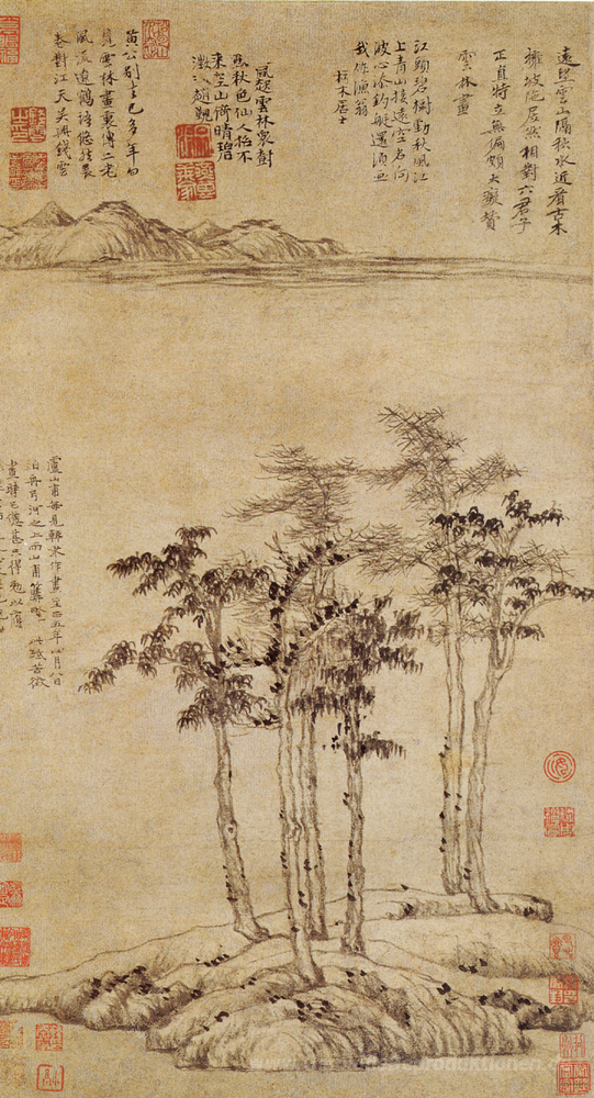 Wir bieten Ihnen eine handgefertigte Reproduktion auf Leinwand des berühmten Kunstwerks 'Sechs Gentlemen' von Ni Zan, aus dem Reproduktionsmuseum.