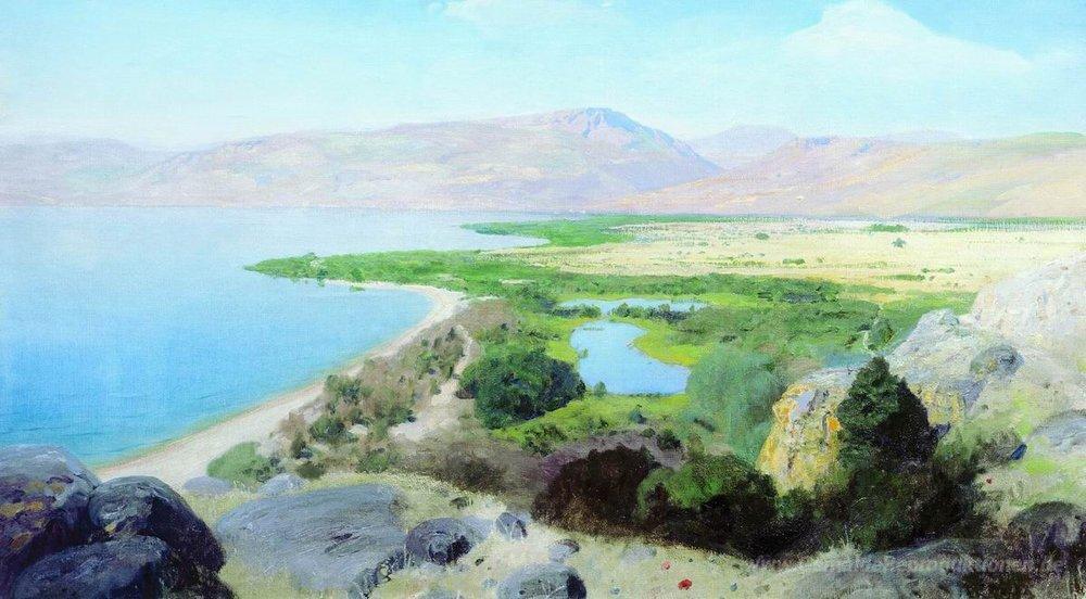 Wir bieten Ihnen eine handgefertigte Reproduktion auf Leinwand des berühmten Kunstwerks 'See Genezareth' von Vasily Polenov, aus dem Reproduktionsmuseum.