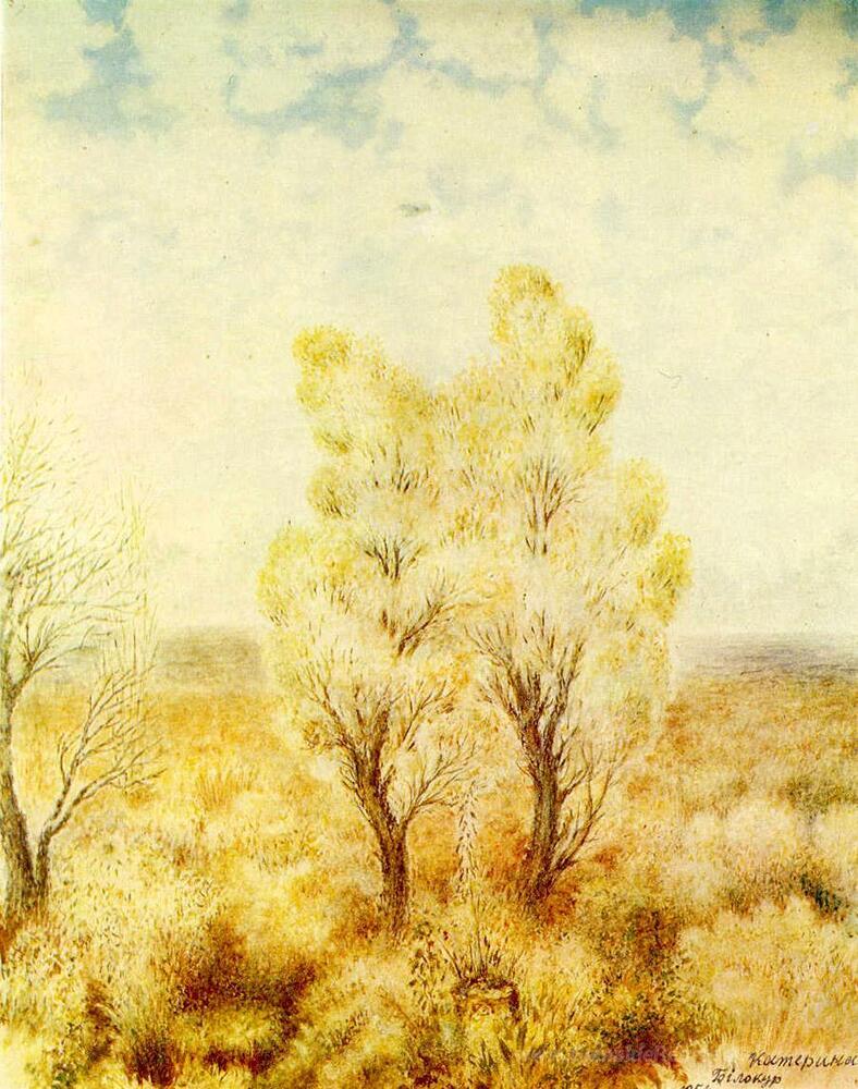 Wir bieten Ihnen eine handgefertigte Reproduktion auf Leinwand des berühmten Kunstwerks 'September in der Bohdanivka Dorf auf dem Damm' von Kateryna Bilokur, aus dem Reproduktionsmuseum.