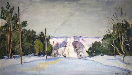 Wir bieten Ihnen eine handgefertigte Reproduktion auf Leinwand des berühmten Kunstwerks 'Shosse im Winter' von Pyotr Konchalovsky, aus dem Reproduktionsmuseum.