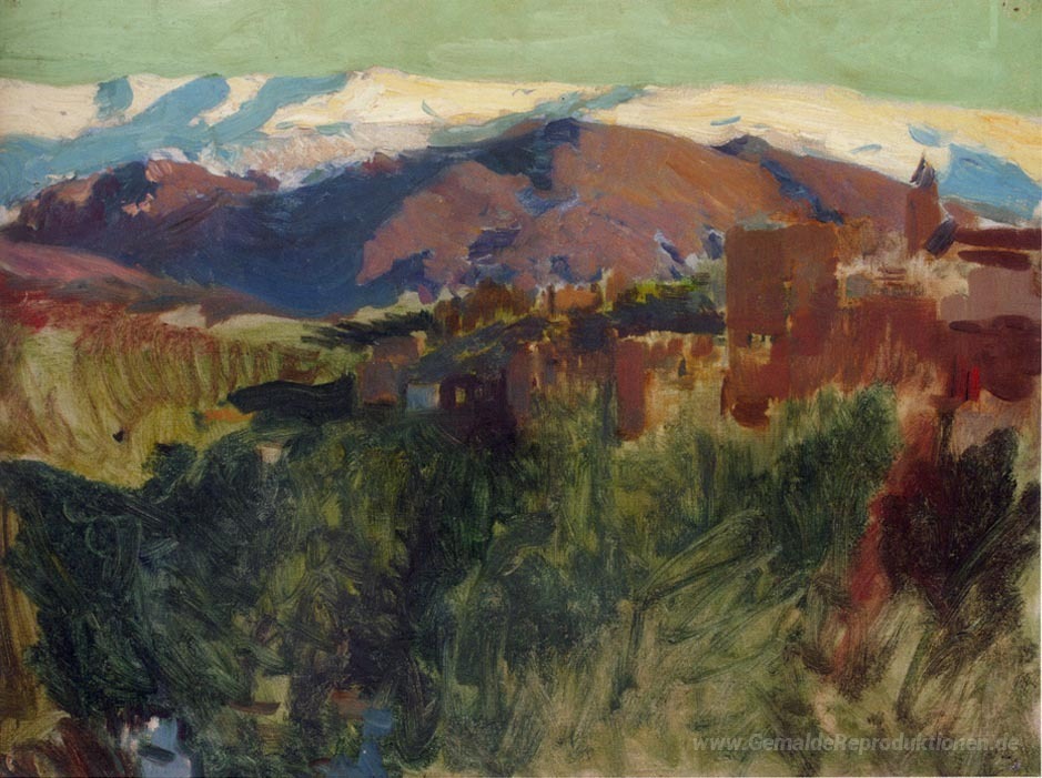 Wir bieten Ihnen eine handgefertigte Reproduktion auf Leinwand des berühmten Kunstwerks 'Sierra Nevada von der Alhambra, Grenada' von Joaquín Sorolla, aus dem Reproduktionsmuseum.