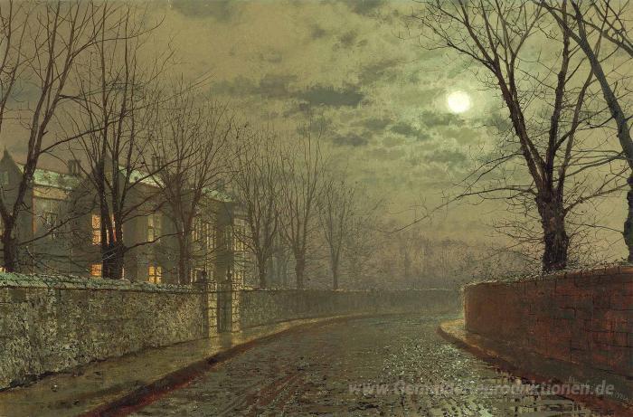 Wir bieten Ihnen eine handgefertigte Reproduktion auf Leinwand des berühmten Kunstwerks 'Silbrigen Mondlicht' von John Atkinson Grimshaw, aus dem Reproduktionsmuseum.