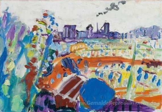 Wir bieten Ihnen eine handgefertigte Reproduktion auf Leinwand des berühmten Kunstwerks 'Sommerlandschaft mit Schlieren Gas Works' von Max Gubler, aus dem Reproduktionsmuseum.