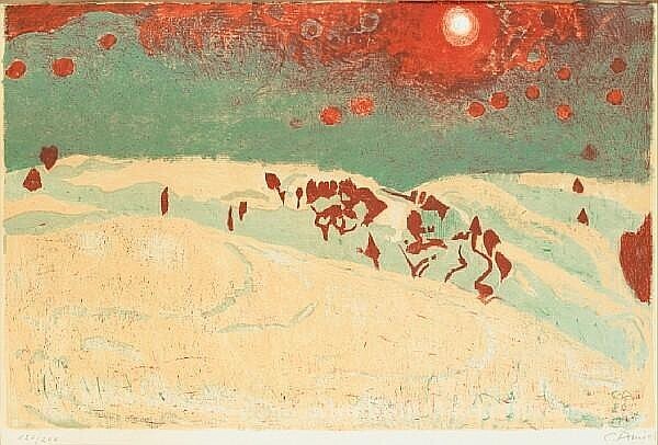 Wir bieten Ihnen eine handgefertigte Reproduktion auf Leinwand des berühmten Kunstwerks 'Sonnenuntergang in einer verschneiten Landschaft' von Cuno Amiet, aus dem Reproduktionsmuseum.