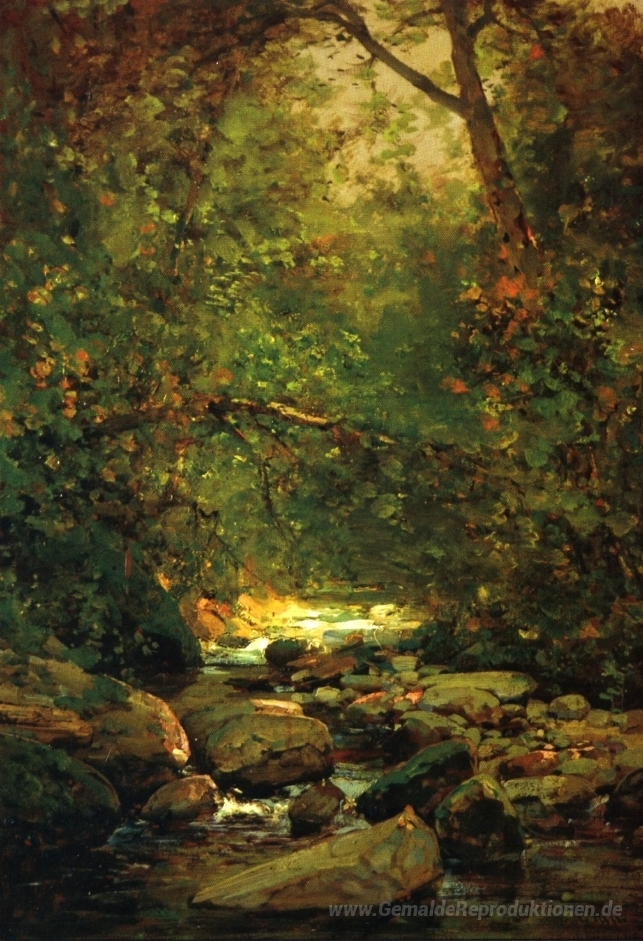Wir bieten Ihnen eine handgefertigte Reproduktion auf Leinwand des berühmten Kunstwerks 'Stream im Wald Winter-' von Thomas Hill, aus dem Reproduktionsmuseum.