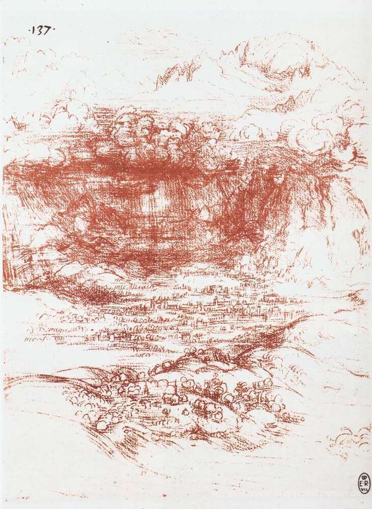 Wir bieten Ihnen eine handgefertigte Reproduktion auf Leinwand des berühmten Kunstwerks 'Sturm über einer Landschaft' von Leonardo da Vinci, aus dem Reproduktionsmuseum.