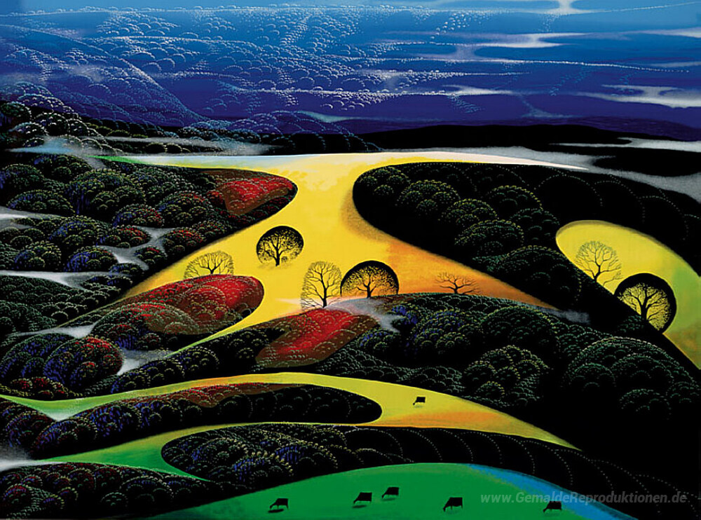 Willkommen in der faszinierenden Welt der Ölgemälde, wo Kunst und Emotionen harmonisch verschmelzen. Entdecken Sie das Meisterwerk Sunset Magie von Eyvind Earle, einem herausragenden Künstler, der mit seinen einzigartigen Stilrichtungen und Techniken eindrucksvolle Landschaften erschafft. Earle ist bekannt für seine lebendigen Farben und die christlichen Elemente, die seinen Werken einen magischen, fast traumhaften Charakter verleihen.