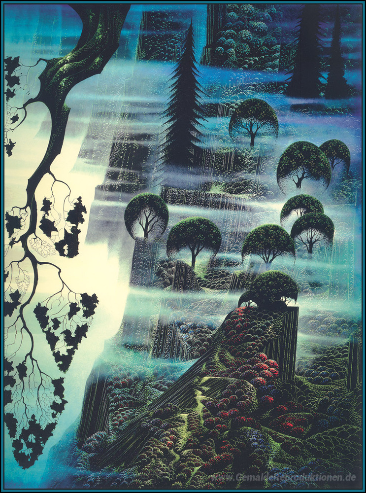 Wir bieten Ihnen eine handgefertigte Reproduktion auf Leinwand des berühmten Kunstwerks 'Surf Wind und Nebel' von Eyvind Earle, aus dem Reproduktionsmuseum.