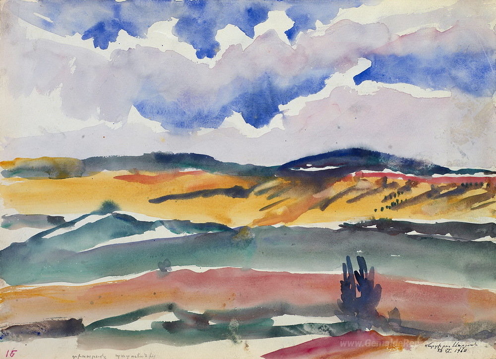 Wir bieten Ihnen eine handgefertigte Reproduktion auf Leinwand des berühmten Kunstwerks 'Szene aus dem Zugfenster' von Martiros Saryan, aus dem Reproduktionsmuseum.