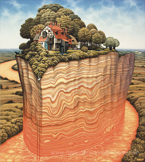 Wir bieten Ihnen eine handgefertigte Reproduktion auf Leinwand des berühmten Kunstwerks 'Tektonik' von Jacek Yerka, aus dem Reproduktionsmuseum.