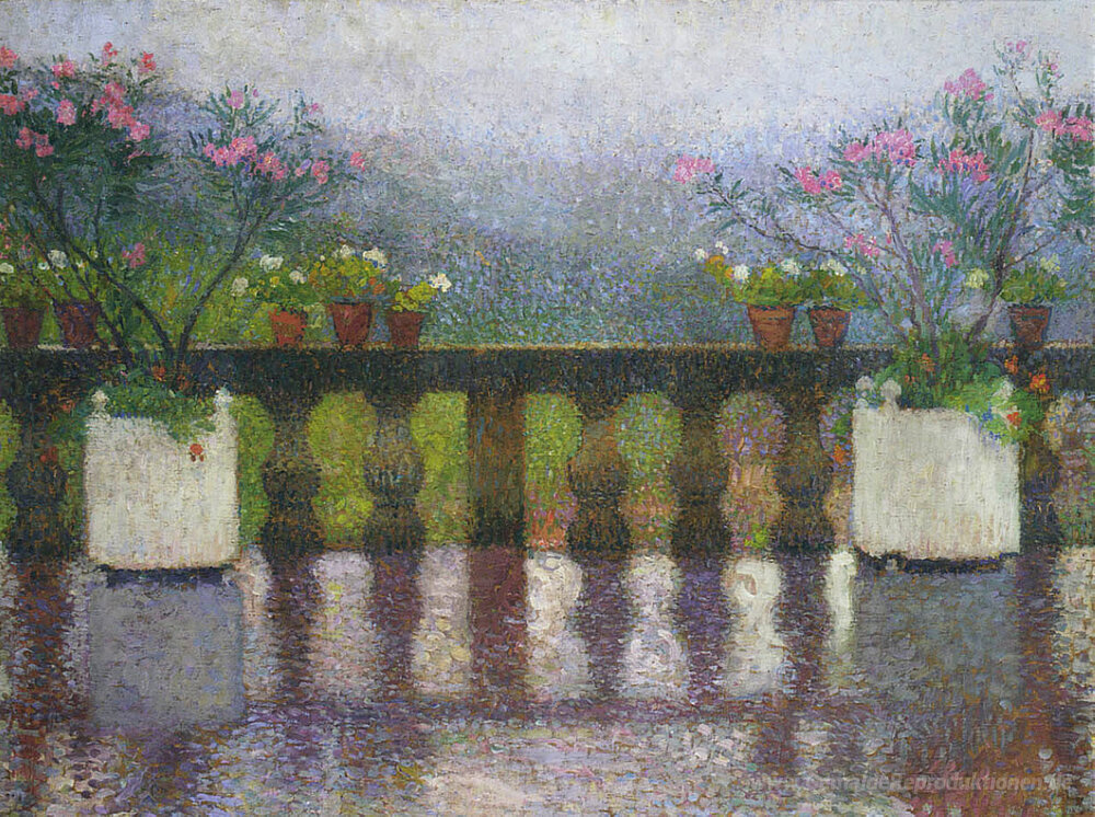 Wir bieten Ihnen eine handgefertigte Reproduktion auf Leinwand des berühmten Kunstwerks 'Terrasse im Regen in Marquayrol' von Henri Martin, aus dem Reproduktionsmuseum.