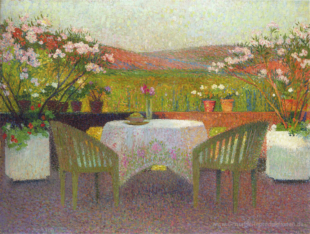 Wir bieten Ihnen eine handgefertigte Reproduktion auf Leinwand des berühmten Kunstwerks 'Terrasse in Marquayrol' von Henri Martin, aus dem Reproduktionsmuseum.