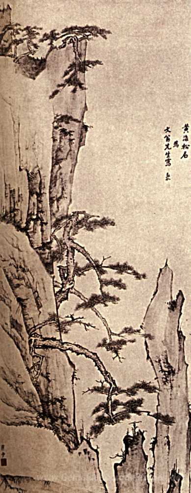 Wir bieten Ihnen eine handgefertigte Reproduktion auf Leinwand des berühmten Kunstwerks 'Terrasse von Zinnober' von Shitao, aus dem Reproduktionsmuseum.