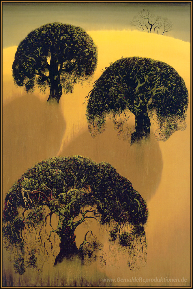 Wir bieten Ihnen eine handgefertigte Reproduktion auf Leinwand des berühmten Kunstwerks 'Three Oaks' von Eyvind Earle, aus dem Reproduktionsmuseum.