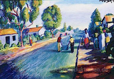 Wir bieten Ihnen eine handgefertigte Reproduktion auf Leinwand des berühmten Kunstwerks 'Township-Szene' von George Pemba, aus dem Reproduktionsmuseum.