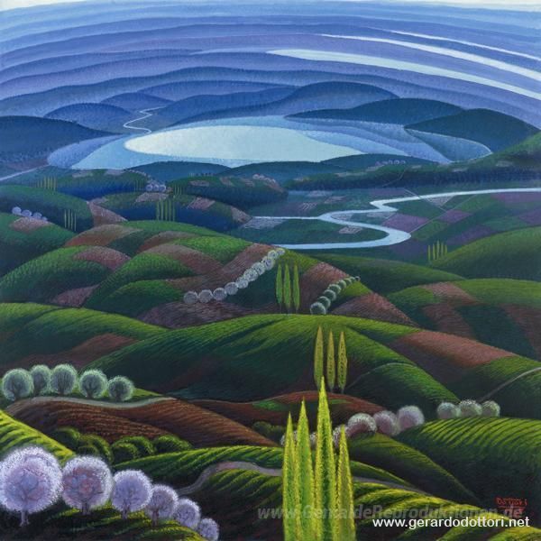 Wir bieten Ihnen eine handgefertigte Reproduktion auf Leinwand des berühmten Kunstwerks 'Umbrien primavera' von Gerardo Dottori, aus dem Reproduktionsmuseum.