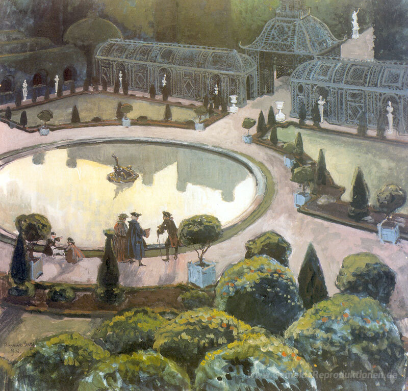 Wir bieten Ihnen eine handgefertigte Reproduktion auf Leinwand des berühmten Kunstwerks 'Versailles. Gewächshaus' von Alexandre Benois, aus dem Reproduktionsmuseum.