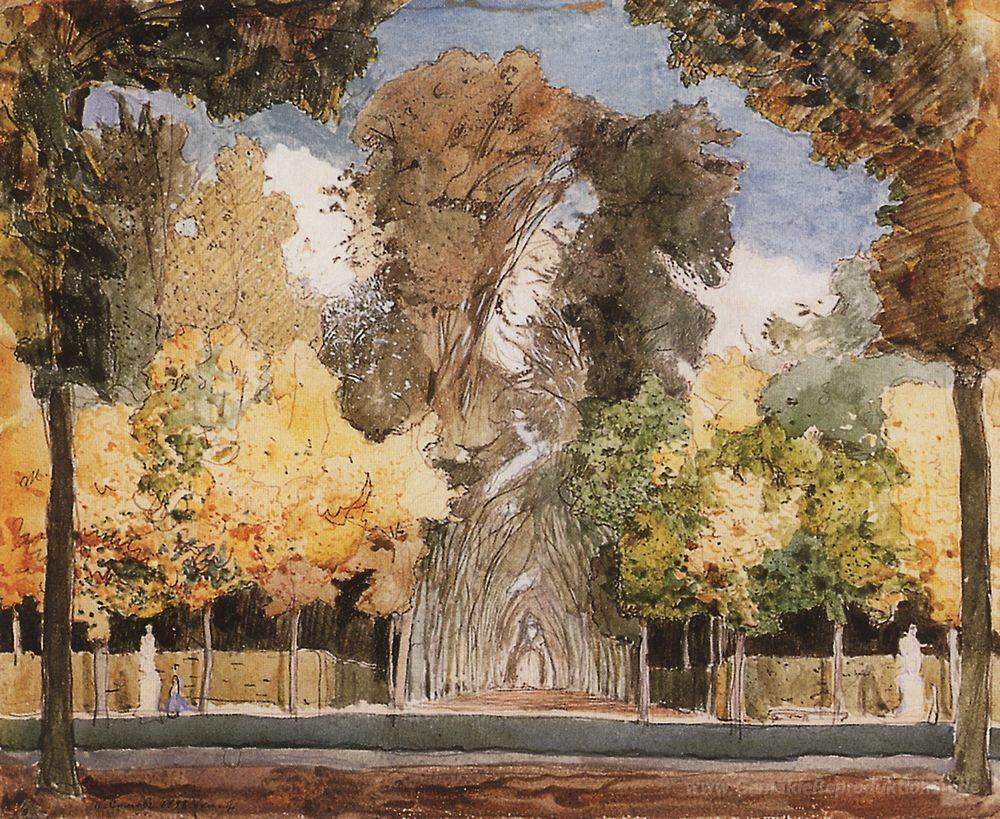 Wir bieten Ihnen eine handgefertigte Reproduktion auf Leinwand des berühmten Kunstwerks 'Versailles Park im Herbst' von Konstantin Somov, aus dem Reproduktionsmuseum.