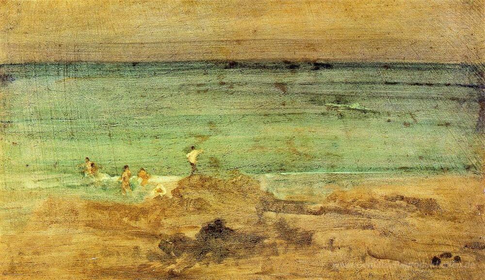 Wir bieten Ihnen eine handgefertigte Reproduktion auf Leinwand des berühmten Kunstwerks 'Violett und Blau: Die kleinen Badegäste' von James McNeill Whistler, aus dem Reproduktionsmuseum.