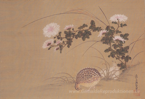 Wir bieten Ihnen eine handgefertigte Reproduktion auf Leinwand des berühmten Kunstwerks 'Wachteln und Chrysanthemen' von Tosa Mitsuoki, aus dem Reproduktionsmuseum.