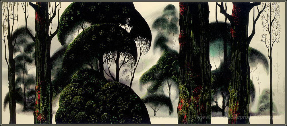 Wir bieten Ihnen eine handgefertigte Reproduktion auf Leinwand des berühmten Kunstwerks 'Wald Magie' von Eyvind Earle, aus dem Reproduktionsmuseum.