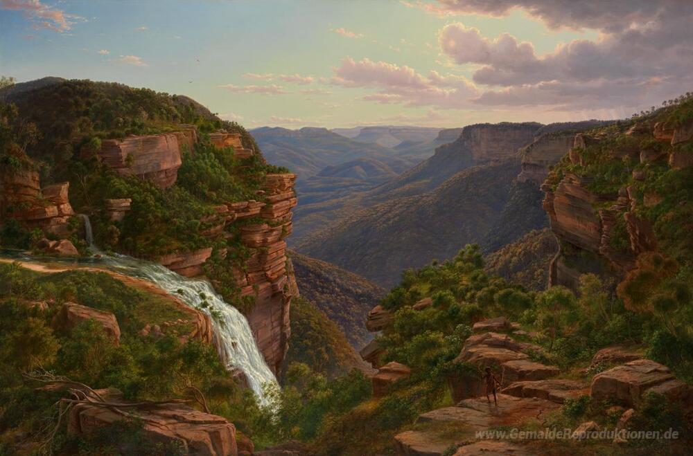 Wir bieten Ihnen eine handgefertigte Reproduktion auf Leinwand des berühmten Kunstwerks 'Weather Creek Falls, Jamieson Valley, New South Wales' von Eugene von Guerard, aus dem Reproduktionsmuseum.