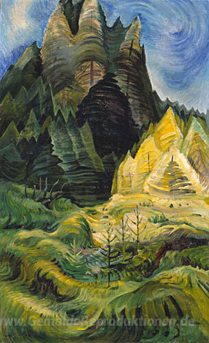 Wir bieten Ihnen eine handgefertigte Reproduktion auf Leinwand des berühmten Kunstwerks 'Wiederaufforstung' von Emily Carr, aus dem Reproduktionsmuseum.