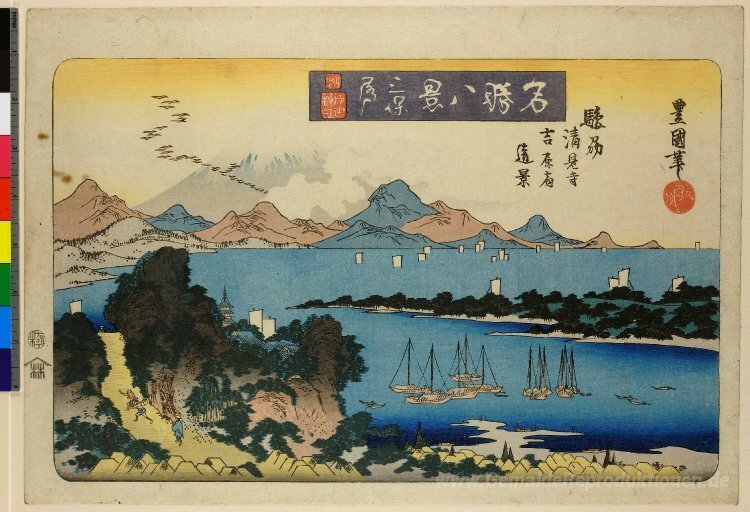 Wir bieten Ihnen eine handgefertigte Reproduktion auf Leinwand des berühmten Kunstwerks 'Wildgänse am Miho, Kiyomi Tempel, Suruga, Yoshiwara' von Utagawa Toyokuni II, aus dem Reproduktionsmuseum.