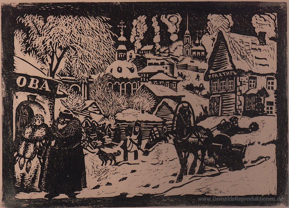 Wir bieten Ihnen eine handgefertigte Reproduktion auf Leinwand des berühmten Kunstwerks 'Winter' von Boris Kustodiev, aus dem Reproduktionsmuseum.