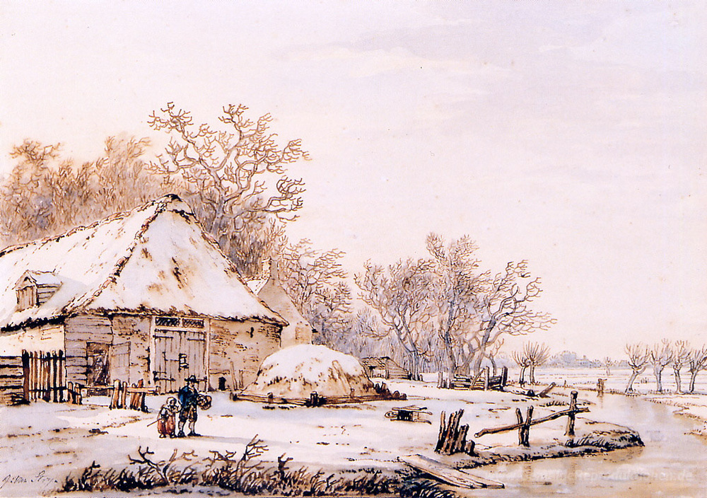 Wir bieten Ihnen eine handgefertigte Reproduktion auf Leinwand des berühmten Kunstwerks 'Winterlandschaft mit Bauernhof' von Jacob van Strij, aus dem Reproduktionsmuseum.