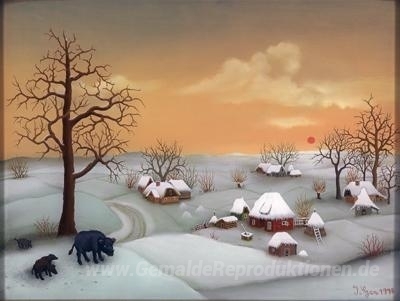 Wir bieten Ihnen eine handgefertigte Reproduktion auf Leinwand des berühmten Kunstwerks 'Winterlandschaft' von Ivan Generalic, aus dem Reproduktionsmuseum.