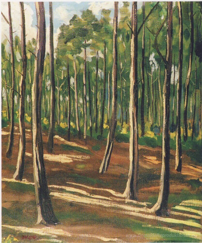 Wir bieten Ihnen eine handgefertigte Reproduktion auf Leinwand des berühmten Kunstwerks 'Woodland-Szene in der Nähe von Mimizan' von Winston Churchill, aus dem Reproduktionsmuseum.