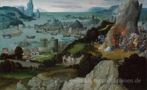 Wir bieten Ihnen eine handgefertigte Reproduktion auf Leinwand des berühmten Kunstwerks 'Wunder von St. Catherine' von Joachim Patinir, aus dem Reproduktionsmuseum.