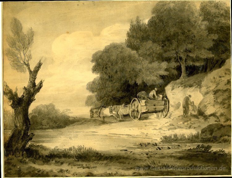 Wir bieten Ihnen eine handgefertigte Reproduktion auf Leinwand des berühmten Kunstwerks 'Zahlen mit Wagen am Straßenrand' von Thomas Gainsborough, aus dem Reproduktionsmuseum.