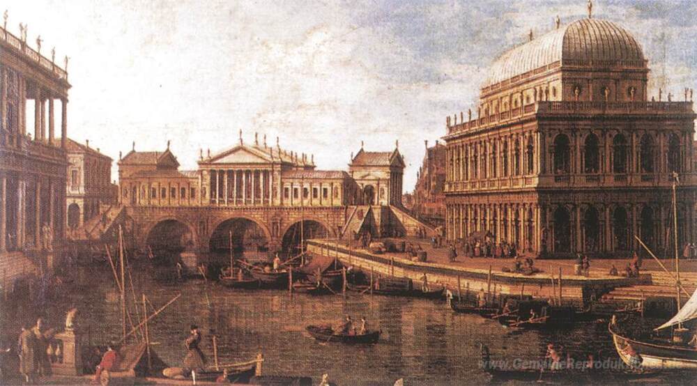Wir bieten Ihnen eine handgefertigte Reproduktion auf Leinwand des berühmten Kunstwerks 'Capriccio: a Palladio-Entwurf für die Rialto-Brücke, mit Gebäude' von Canaletto, aus dem Reproduktionsmuseum.
